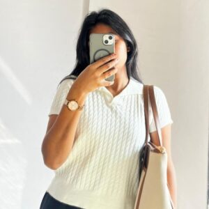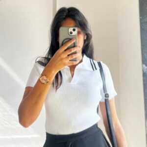 White Ribbed Polo Collar Knit Top