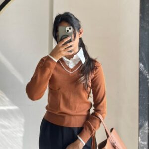 Brown V-neck With Attached White Collar Sweater