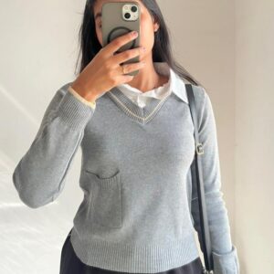 Grey V-neck With Attached White Collar Sweater