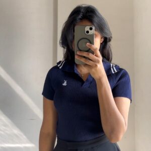 Navy Ribbed Polo Collar Knit Top